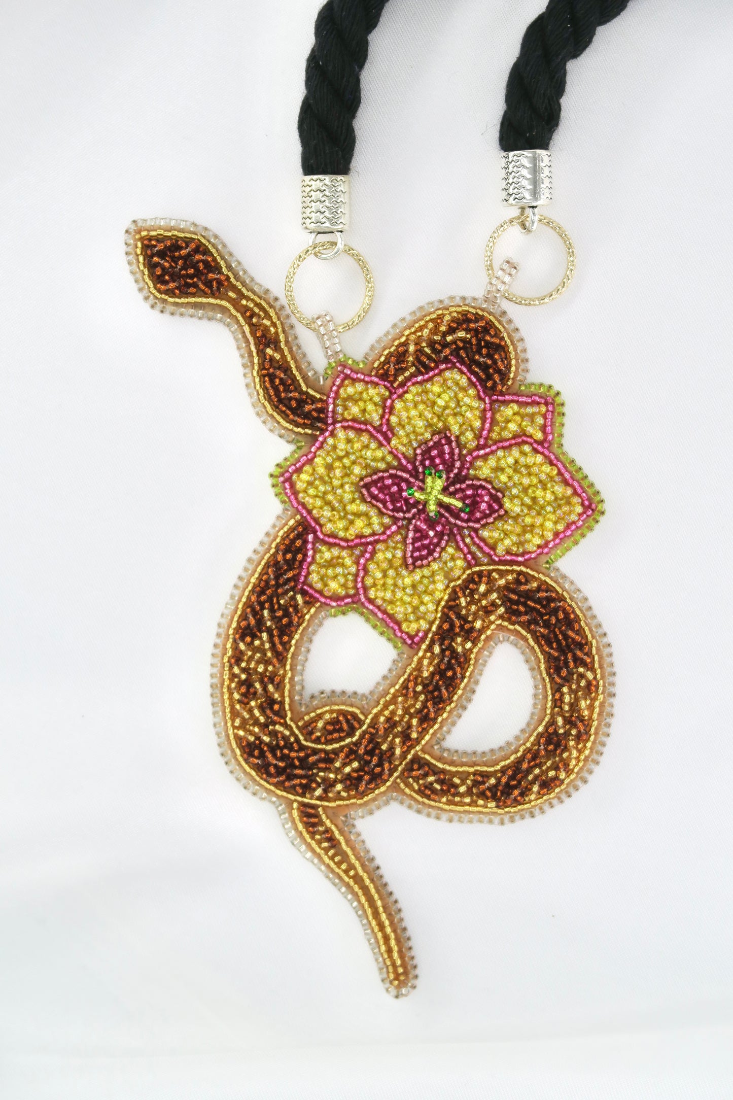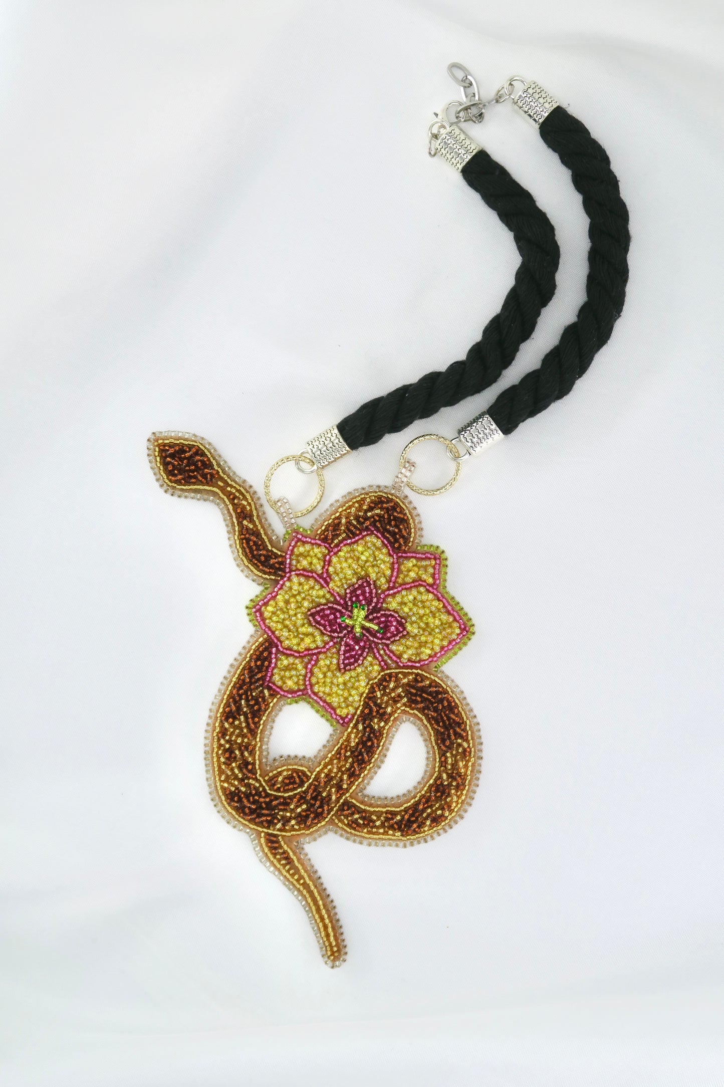 Material: Delicate glass beads, expertly embroidered by hand, faux leather base, accented with twisted cotton rope and alloy hardware.